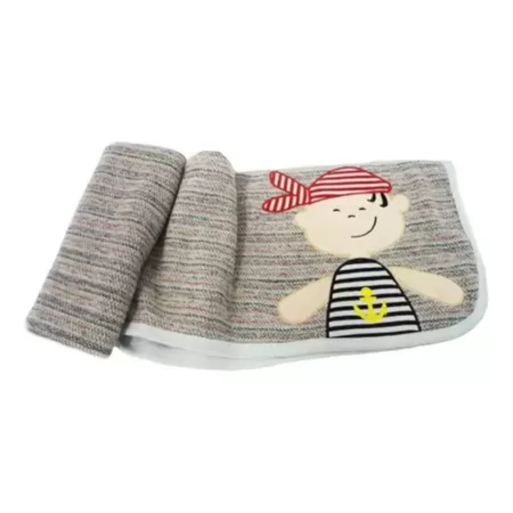 Manta Zip Toys listrada, aplique pirata, forrada em poliéster azul bebê, muito macia para seu bebê ter uma noite tranquila e confortável.