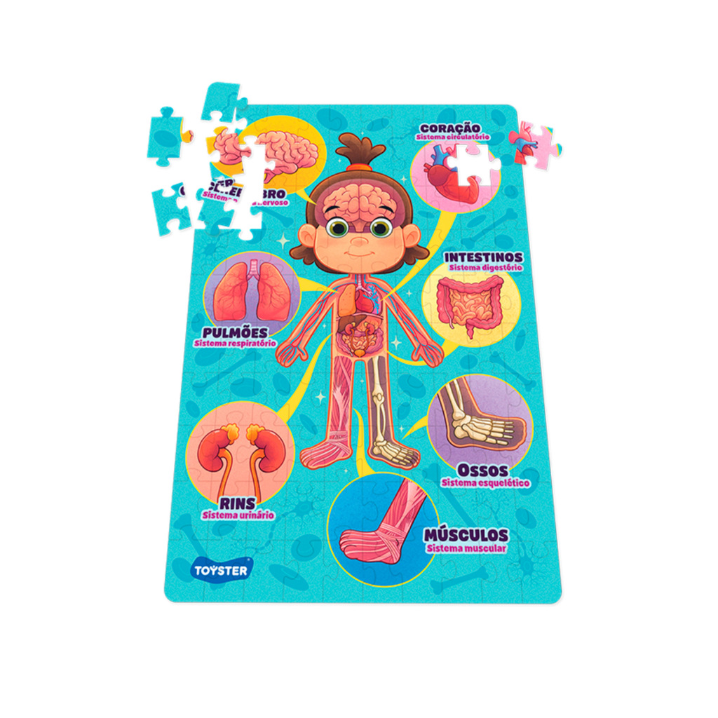 Quebra-Cabeça Por Dentro do Corpo Humano 100 Peças - Toyster Aprender brincando pode ser ainda mais divertido com o Quebra-Cabeça Por Dentro do Corpo Humano 100 Peças da Toyster. Com esse quebra-cabeça educativo de 100 peças, as crianças vão aprender sobre o corpo humano, onde ficam os órgãos, como eles são, inclusive seus nomes e em qual parte do sistema humano ele pertence, enquanto brincam montando esses 3 quebra-cabeças. Com peças resistentes e coloridas, ele estimula o cérebro e auxilia no desenvolvimento da coordenação motora e habilidades cognitivas. Idade recomendada: Acima de 3 anos.