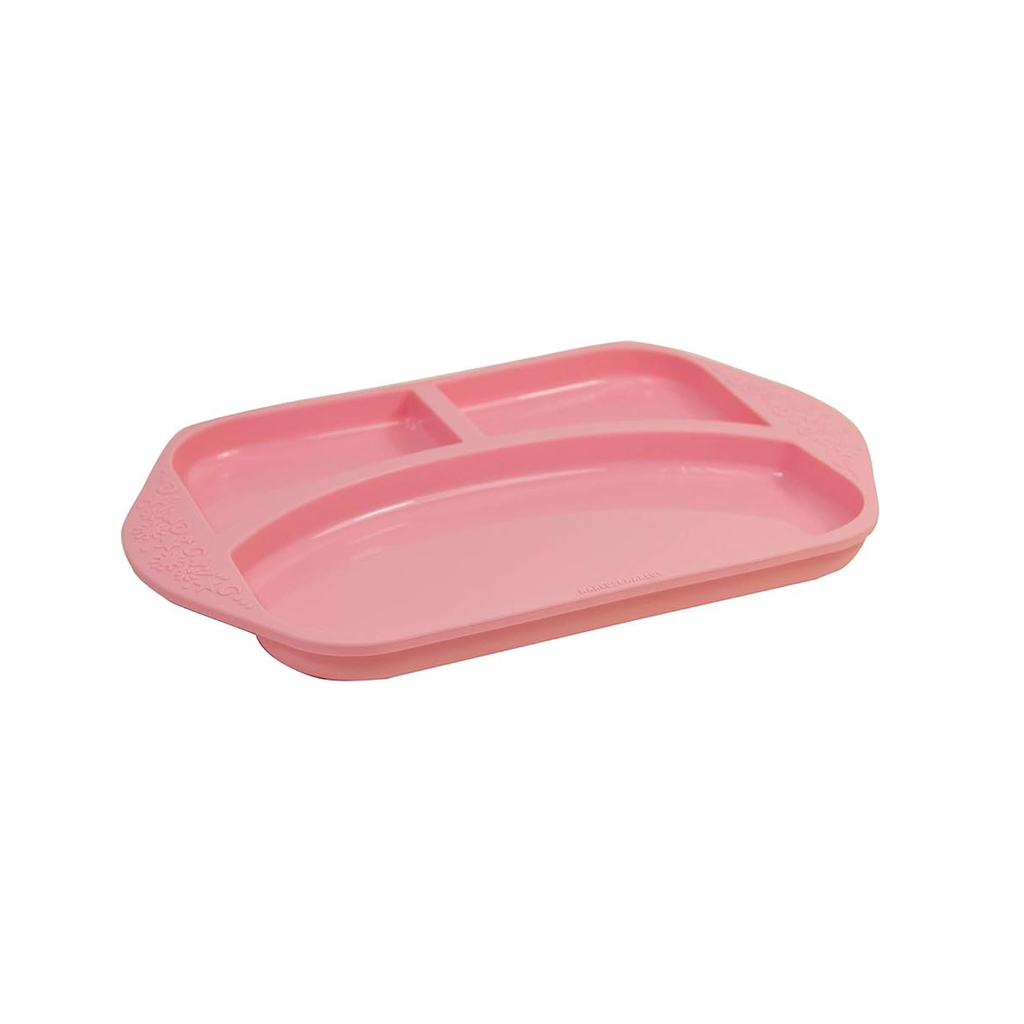 Prato com 3 divisórias 100% em silicone, auxília com o controle de porções e mantem a comida separada, adere a superfície, pode ser levado ao micro ondas e na máquina de lavar. .